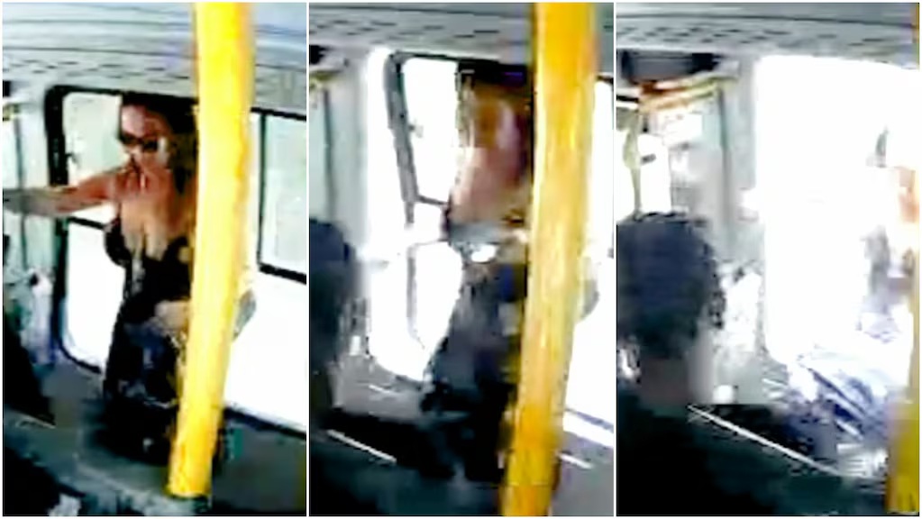 Las imágenes muestran que la mujer viajaba apoyada contra una ventana mientras el transporte circulaba lleno. El incidente ocurrió cuando la estructura del marco comenzó a desprenderse repentinamente durante el trayecto vial.