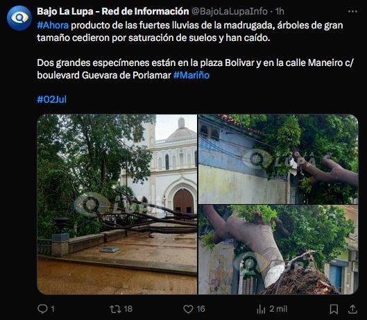 El estado Nueva Esparta conocido como la Isla de Margarita también se ha visto afectado por las fuertes lluvias, en la Plaza Bolívar del Boulevard de Porlamar, municipio Mariño, dos grandes árboles cayeron debido a la saturación de los suelos.