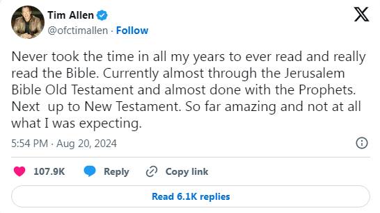 En esta última publicación, que compartió en su cuenta personal X, la estrella de “Toy Story” reveló que casi ha terminado de leer el Antiguo Testamento en la Biblia de Jerusalén, una traducción de las Sagradas Escrituras. Ahora planea comenzar a leer el Nuevo Testamento.