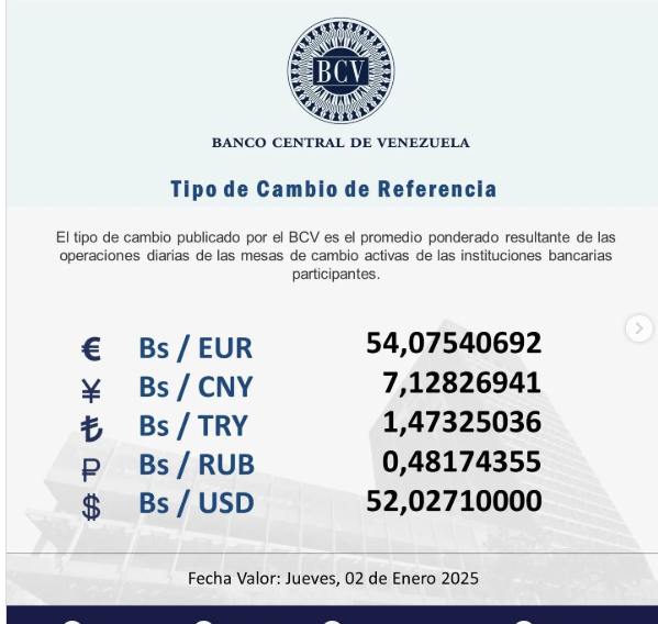 De igual manera el BCV publicó el monto en bolívares para otras monedas para el cierre del 2024 y el comienzo del año 2025, así el euro se cotizará en Bs. 54, 07, el yuan en Bs. 7,12, la lira turca en Bs. 1,47 y el rublo en Bs. 0.48