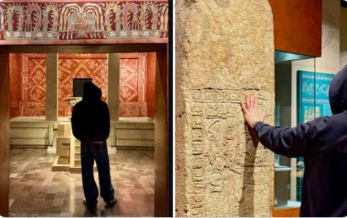 El artista visitó el Museo Nacional de Antropología durante su estancia en la capital. Las imágenes muestran al músico tocando directamente una invaluable pieza arqueológica antigua.