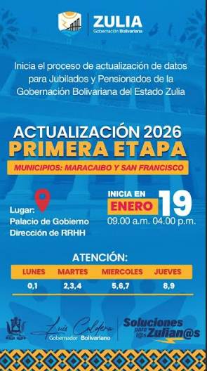 Este lunes 19 de enero arrancará formalmente el nuevo censo de jubilados de la Gobernación del Zulia. El proceso busca actualizar la base de datos estatal.