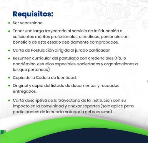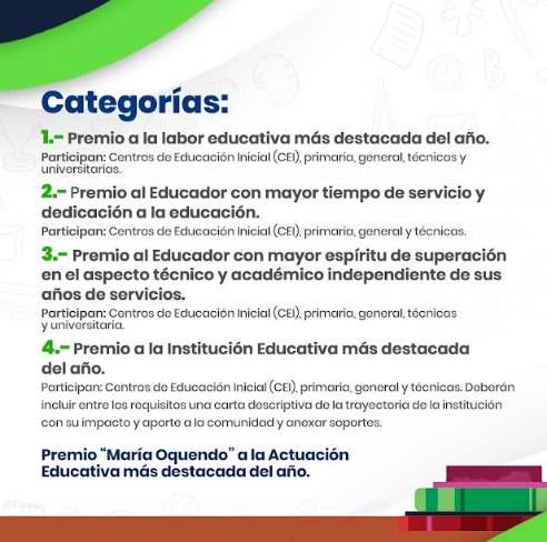 3* Premio al Educador con mayor espíritu en el aspecto técnico y académico independientemente de sus años de servicios, participan: Centros de Educación Inicial (CEI), primaria, general, técnicas y universitaria.
