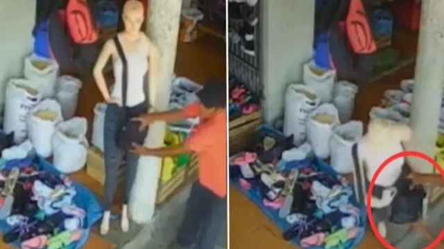 Un ladrón confundió a un maniquí con una persona real y trató de robarle una cartera. El momento insólito se registró en un mercado de Warnes, Santa Cruz (Bolivia).e