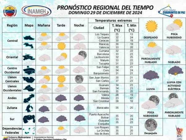 En su reporte diario el Instituto Nacional de Meteorología e Hidrología (Inameh), informó que para este domingo 29 de diciembre, se estima el cielo con nubosidad parcial y zonas despejadas en gran parte del país.