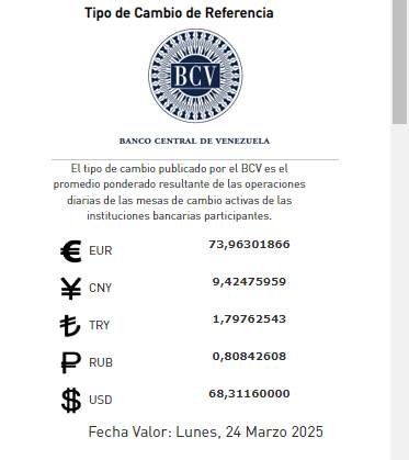 Mientras que las demás monedas se cotizarán de la siguiente manera: EURO 73,96; CNY 9,42; TRY 1,79 y RUB 0,80 Bolívares; según publicó el Banco Central de Venezuela en su página web y redes sociales.