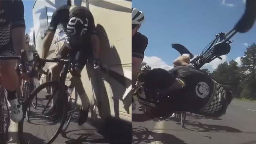El golpe fue tan fuerte que Wallace perdió su casco de seguridad. Mientras tanto, otros ciclistas del grupo embistieron al hombre y también cayeron al suelo, dejando unas imágenes aún más impactantes.
