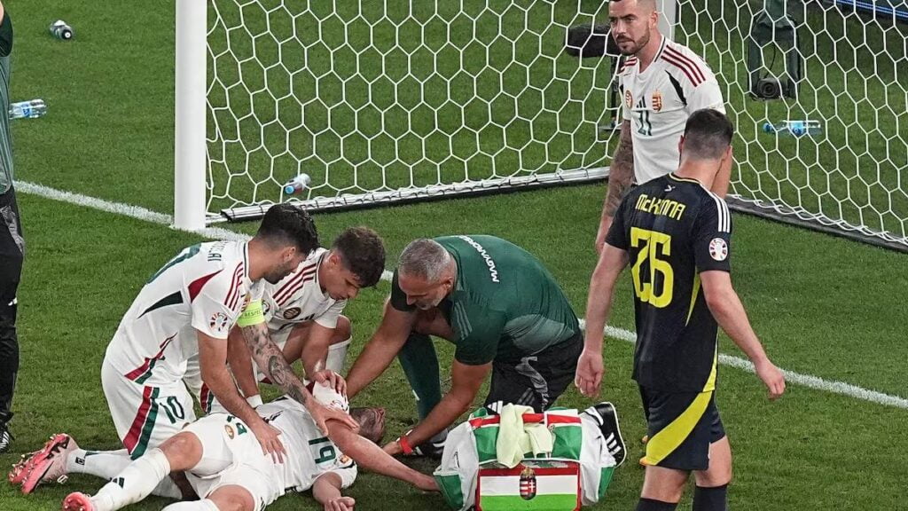 Momentos de intensa tensión este domingo luego que sacaran inconsciente a Barnabas Varga, delantero de Hungría por el fuerte choque contra el arquero de Escocia.