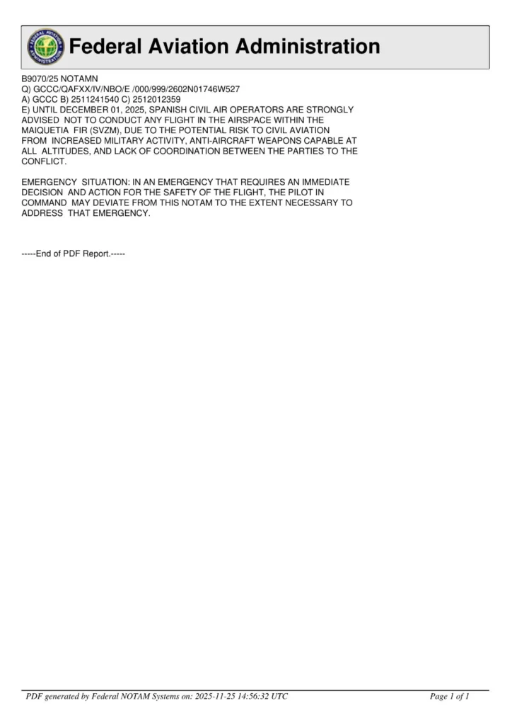 El NOTAM B9070/25, emitido por Enaire a solicitud de la AESA, pidió suspender operaciones civiles españolas en el espacio aéreo de Maiquetía.