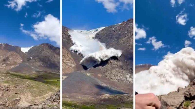 El hecho, que fue grabadas por un turista identificado como Harry Shimmin, ocurrió en el paso Juuku de la cordillera Terskei Ala-Too el pasado 8 de julio. Por fortuna el hombre sobrevivió tras refugiarse detrás de una roca.