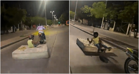 Dos jóvenes están en el centro de la polémica luego de protagonizar un temerario video viral en plenas calles de Colombia. En el clip aparece a un hombre manejando una motocicleta, mientras arrastra un colchón por el asfalto, donde está otro individuo grabando todo.