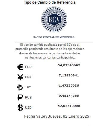 La cotización de 52,02 será la establecida para este inicio de 2025 en las transacciones bancarias y comerciales tanto para el sector público y privado. Durante los días 31 de diciembre y 1 de enero la banca no laborará por tratarse de días festivos.
