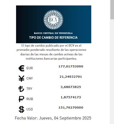 Para este jueves 4 de septiembre la cotización de la moneda estadounidense se ubica en 151,76 Bolívares superando la barrera de los 150, luego que así lo estableció el Banco Central de Venezuela (BCV) al cierre de la jornada del miércoles, registrando el dólar un nuevo aumento en relación a su precio anterior.