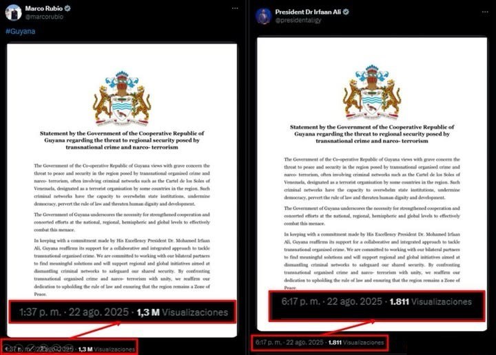 En su canal de Telegram, Rodríguez publicó capturas de pantalla de un comunicado difundido por el senador estadounidense Marco Rubio y el presidente de Guyana, Irfaan Ali. El texto oficial hacía referencia a una supuesta amenaza a la seguridad regional por parte de «el crimen organizado y el narcoterrorismo.