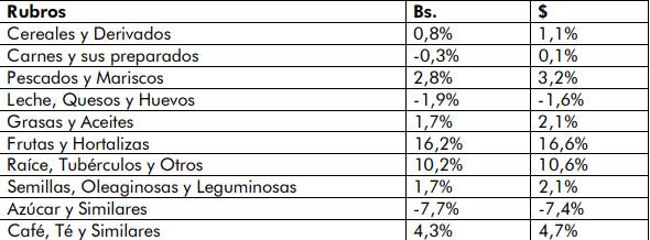 Por su parte, las frutas y hortalizas mostraron el mayor incremento, con un alza del 16.20% en bolívares y del 16.60% en dólares.