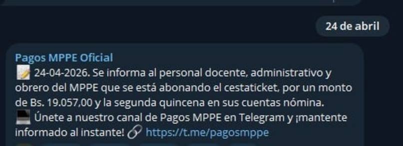 El Ministerio de Educación (MPPE) inició este 24 de abril la cancelación de la nómina y el bono de alimentación a todo su personal. La medida beneficia directamente a los trabajadores docentes, administrativos y obreros de la institución.