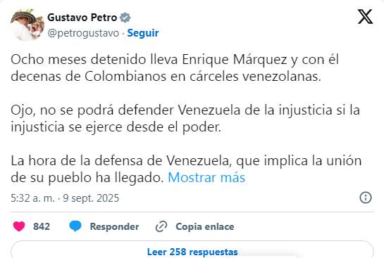El presidente de Colombia Gustavo Petro se solidarizó este martes con el dirigente Enrique Márquez quien cumplió ocho meses detenido en Venezuela.