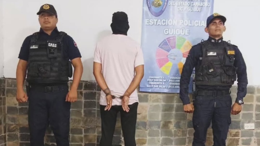 La Policía de Carabobo informó este viernes en sus redes sociales sobre la captura del hombre, cuya identidad no fue publicada. El procedimiento se llevó a cabo en el sector La Bolivariana, parroquia Guigue, municipio Carlos Arvelo.