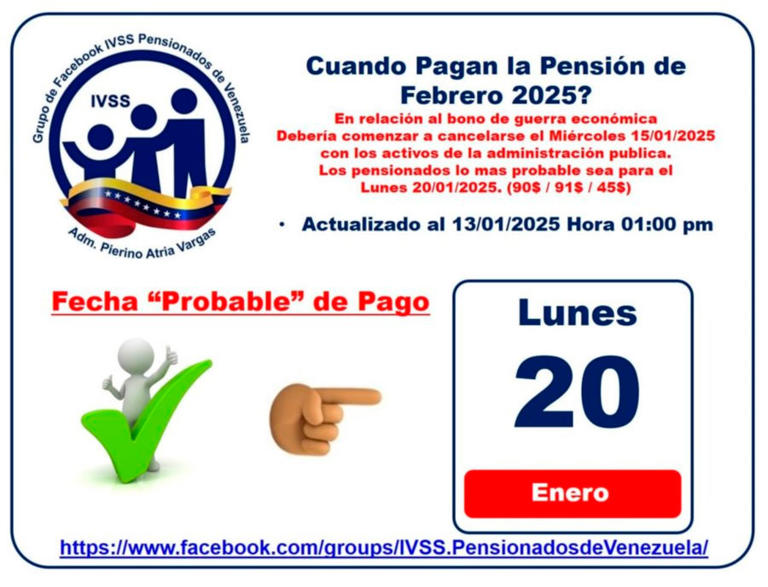 Por su parte, el Canal IVSS Pensionados de Venezuela en Telegram informó, extraoficialmente, que el pago de la pensión correspondiente al mes de febrero, sea cancelado el próximo 20 de enero, pero esto no ha sido confirmado.