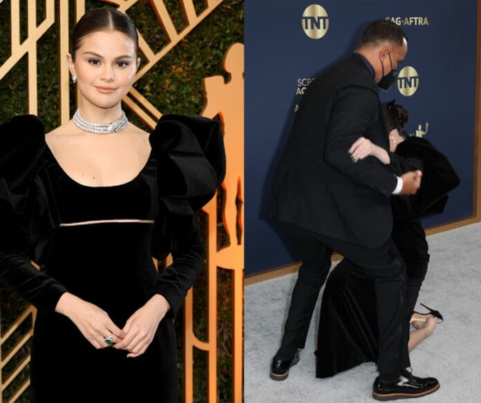 El domingo 27 de febrero por la noche se llevó a cabo la 48ª edición de los Annual Screen Actors Guild Awards donde asistieron las grandes celebridades del mundo del cine y la televisión, por este motivo Selena Gómez acudió para su presentación especial donde tuvo un paso inesperado tras tropezar y caer de rodillas frente a los fotógrafos.