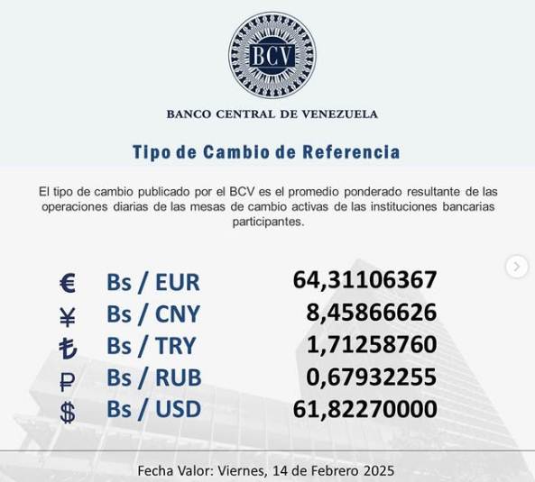 Por lo tanto, esa será la tasa vigente para este viernes 14 de febrero de la moneda estadounidense para las transacciones financieras y comerciales tanto para el sector público como privado dentro del territorio nacional; además sera la cotización del Dólar BCV para las operaciones de las mesas de cambio para las entidades bancarias participantes.