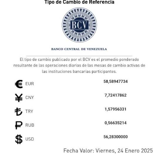 Mientras que el Euro registrara un valor de 58,58 Bolívares, y las demás divisas tendrán el siguiente precio: el yuan en Bs. 7,72; Por otra parte la lira turca en Bs. 1,57; mientras que el rublo quedó en Bs. 0,56.