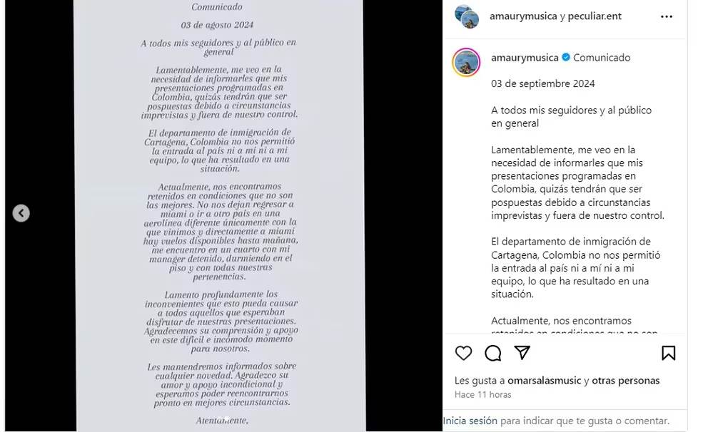 Amaury Gutiérrez detalló que tanto él como su manager tuvieron que pasar la noche en el suelo de una sala de detención en el aeropuerto, describiendo la experiencia como incómoda y difícil. Además, agradeció a sus seguidores por el apoyo recibido durante este difícil momento y prometió mantenerlos informados sobre cualquier novedad respecto a la reprogramación de sus conciertos.