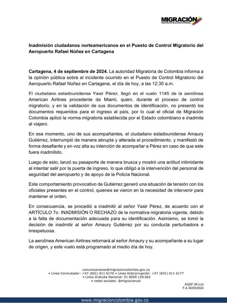 Siendo las 10:04 a.m., del 4 de septiembre, Migración Colombia compartió un comunicado a la opinión pública, relataron lo sucedido. Según informó Migración Colombia, la acción se desencadenó cuando se detectaron irregularidades en los documentos de identificación durante el proceso de control migratorio.