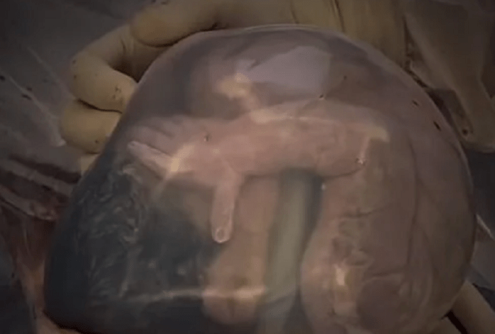 En el clip se observa al pequeño con la mano en su rostro y sus piernas dobladas, en posición fetal, además de traer el cordón umbilical alrededor de su cuello, razón por la cual el médico decidió realizar una cesárea por ser algo muy peligroso, al punto de causar asfixia.
