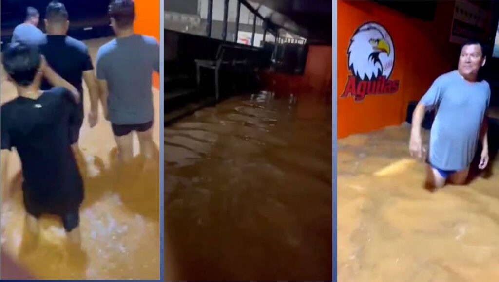 En Instagram, se ha viralizado un material que muestra el nivel de inundación que ocasionaron las precipitaciones en el coso maracaibero, lo que obligó a las Águilas a suspender de manera consecutiva sus juegos correspondientes a martes 12 y miércoles 13 ambos ante Tigres de Aragua. El dogout rapaz, quedó convertido en un pantano, una piscina.